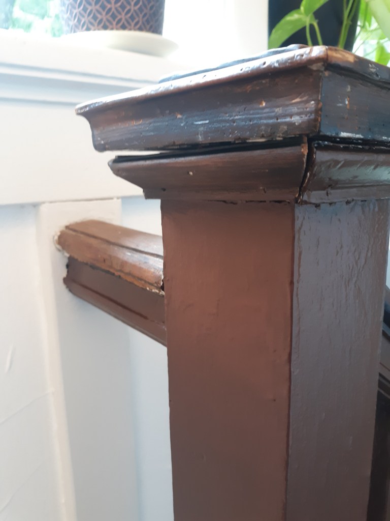 Probably originally stained wood, they’d been painted white, then later painted with a thin layer of high gloss black paint, white paint still showing through in several places. I found the perfect paint color (Chocolate Therapy) to blend in with the wood to give the appearance of being as original as possible.