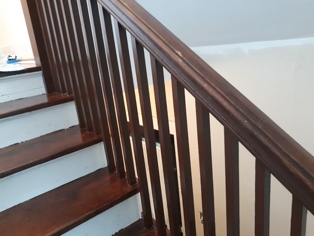 I scraped and sanded all sides of each rail, wiped them down, and taped off the floor before starting to paint. I used a brush to cut in and then a small roller wherever possible to avoid obvious brush strokes. Two coats of paint on all of it. So far, I’ve only been able to complete the top set so one picture also shows the unfinished lower rails for contrast. We’ll complete the bottom set after the construction in the hall is finished to prevent scratches. Remember if you use painter’s tape to pull it up before the paint is dry. I waited a little too long to pull it up and I’ll have to go back and touch up some areas with a brush where it pulled away the new paint.
