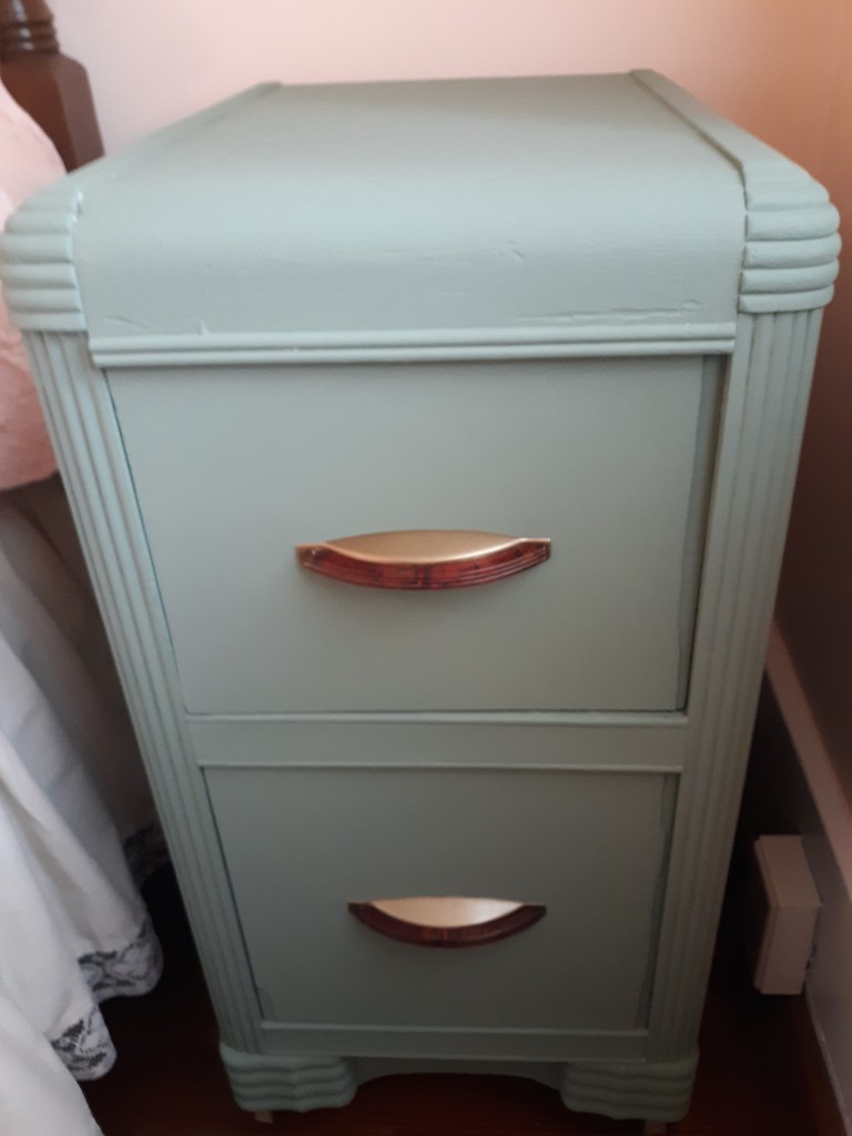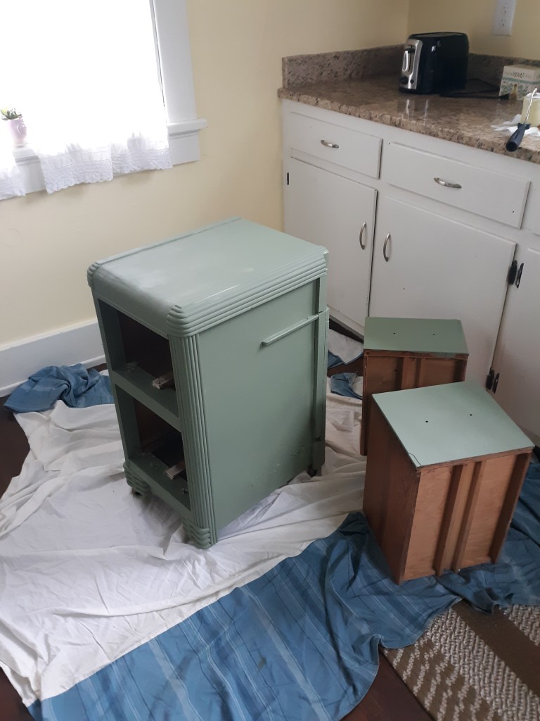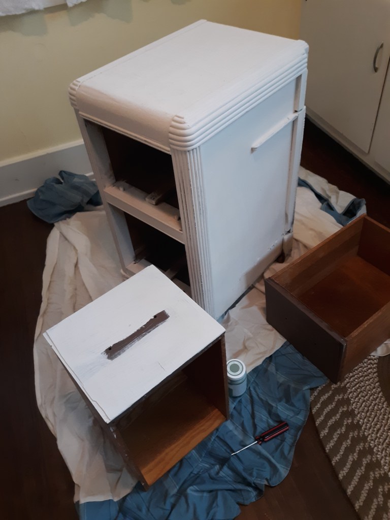 The second project was an end table I picked up off the side of the road (barely, it was so heavy!). It was not in good condition and it had a horrible paint job, but I needed an end table for beside my bed and I really liked this one. I could tell it was old because of the shape, the detail of the trim (which matched the “waterfall” pattern in my other furniture), and the little wooden wheels. I also noticed that it hadn’t originally been an end table, but half of a vanity. The tiny little piece of trim on one side gave me that clue. The only way I knew what that piece of trim meant is because my great grandmother had done the same thing with her vanity set (of a similar age), taking it apart to make two end tables.