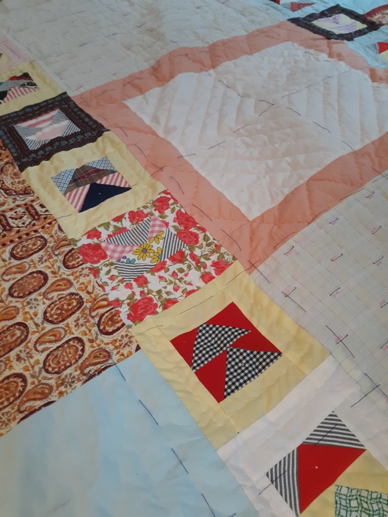While listening to sessions, I am putting the finishing touches on a quilt. This quilt top was wadded up in the wardrobe I purchased and restored. I washed it, added batting and backing, and have been quilting it using a new technique for me called big stitch quilting. It will be finished just in time to be an extra blanket for curling up with a good book (my list is growing long) and a cup of tea.