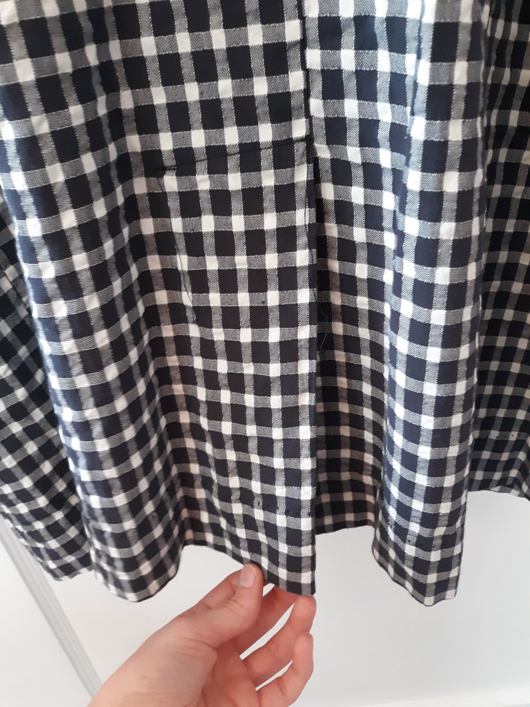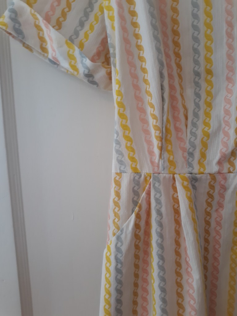 This blue dress is probably my favorite of the lot. It’s casual and loose fitting enough that it is very comfortable, but has a great 60’s silhouette and I love the details! The colors in the pattern are great for me and when I wear it, I feel like I’ve stepped into the world of Hidden Figures (I highly recommend that movie by the way). I just had a small repair to make on one of the shoulders.