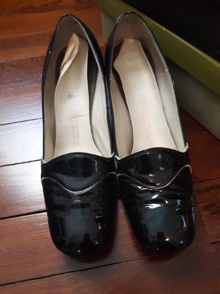 The final pair is simple, but sweet. They have a low heel and black matte finish. They were in good shape with only a few scuffs I fixed with a sharpie. Brand: Selby, Size 7