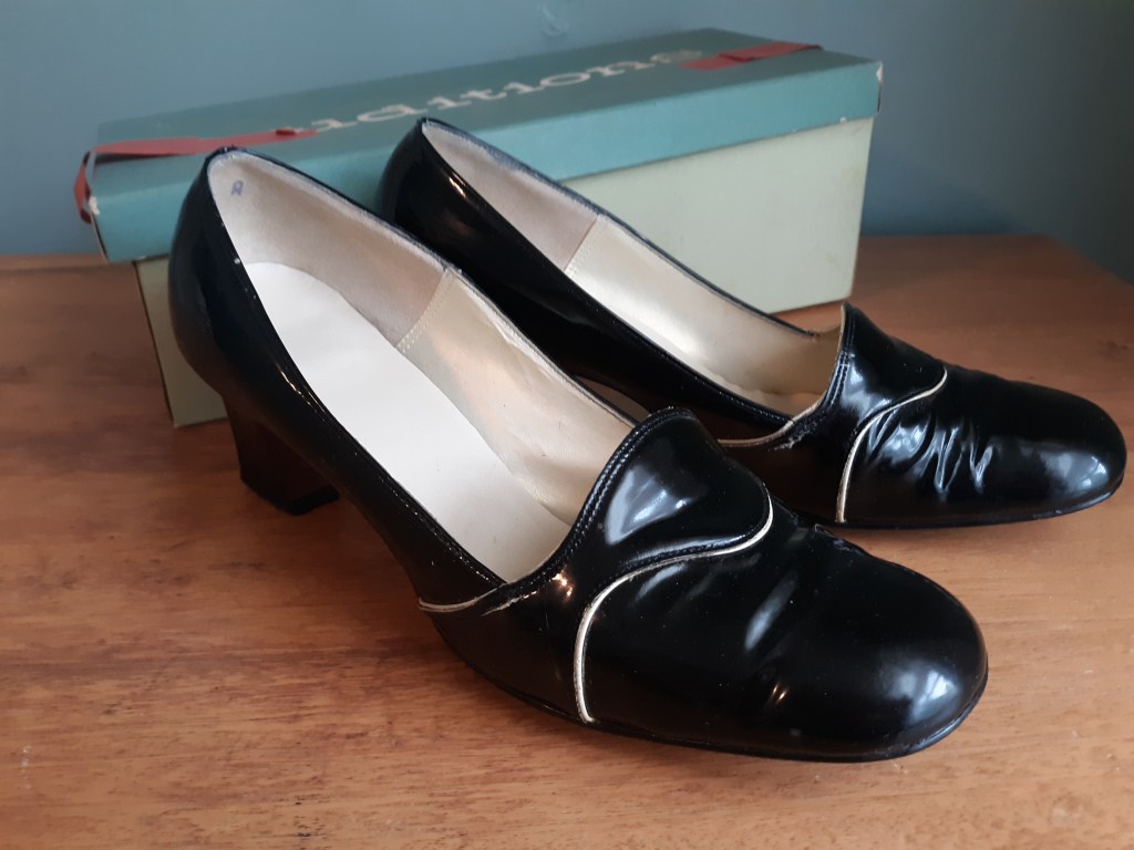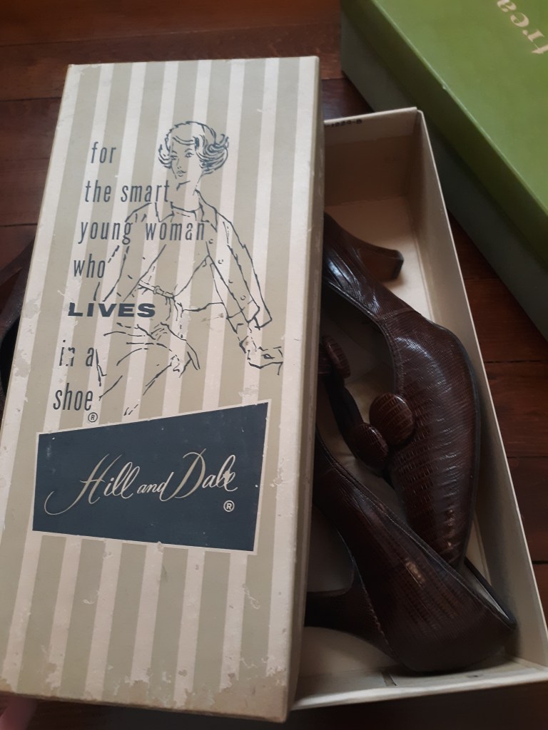 Here is another pair of exotic leather which benefited from a quick shine. These look like alligator skin, probably from the late 50s or early 60s. The slogan on the box makes me laugh! Brand: Naturalizer, Size 7