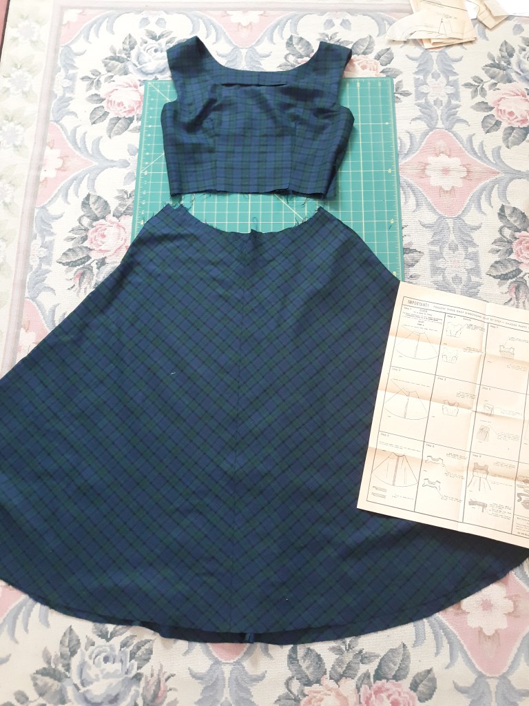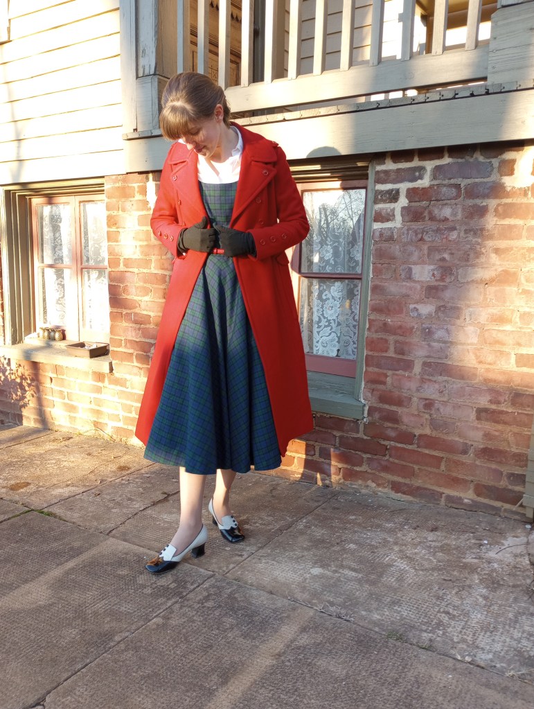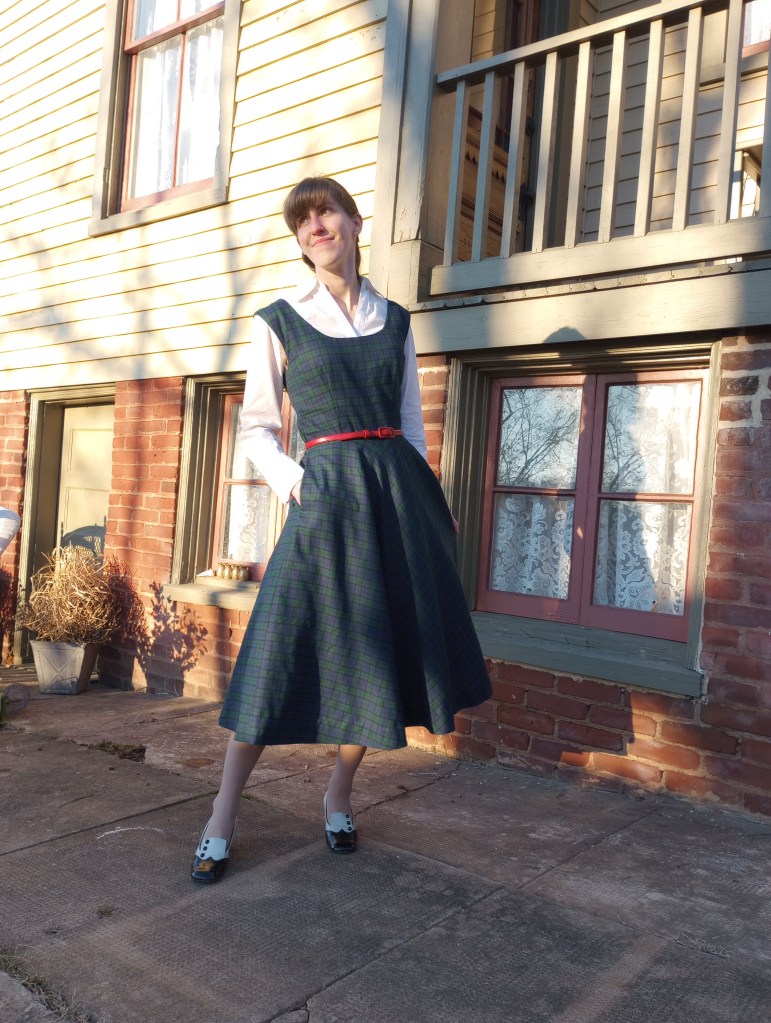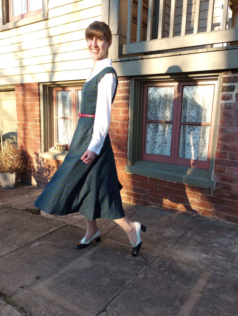 The next winter layering project was a 1950s jumper. I used Butterick 6065 and also referenced Simplicity 1222 c. 1955 for inspiration and some supplemental instruction. Most of my dresses are very light weight and summery in style. I wanted something that would look right for winter and that I could layer with a long sleeve blouse and leggings/hose for warmth. I only had three options in my fabric stash that had enough yardage. I liked a green and blue plaid the best. I was almost done when I realized it was the same colors and similar pattern as the jumpers that are part of the elementary school uniform at the school where I teach. Haha! I guess I won’t be wearing this on Tuesday or Thursdays.
