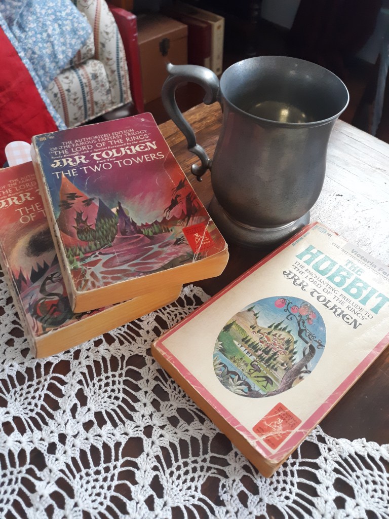 1. Aaakkk! and you didn’t invite me??!! If I had known, I would have crashed & made off with your teaspoons in my umbrella! And no mention of serving MUSHROOMS!? On the other hand, I am so glad to see that you actually have the ORIGINAL 1970 editions (like mine!), not the more modern Celtic covers, although those would probably be more culturally appropriate. Your outfit is adorable but your feet lack fur! 😉