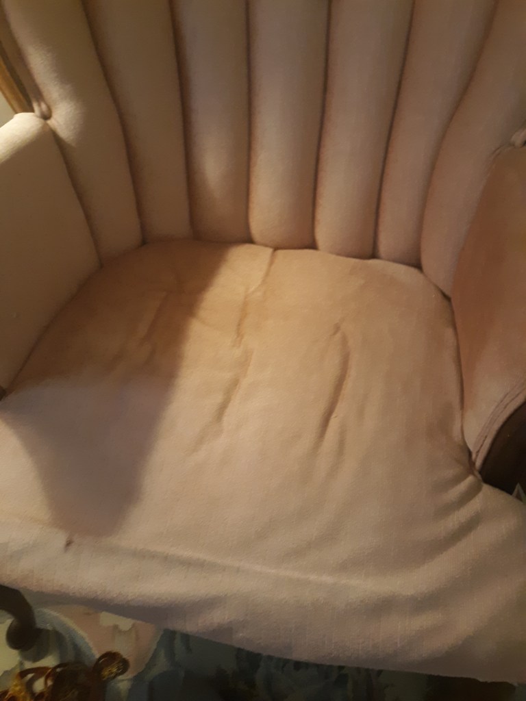 And finally, I made some repairs to my two pink wingback chairs. They had been long due for some attention! The seat cushion had been so worn down that the upholstery was starting to tear on the wood frame of the chair. With my mom’s help, we cut open the front of each chair and added foam and cotton batting. While we had it open, I also ironed a patch underneath the little spot where the upholstery was beginning to tear. Mom used a staple gun to put the upholstery back in place then I hot glued a piece of trim over the staples. The chairs should be good a while longer!