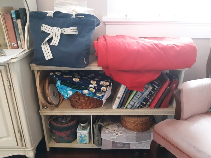 Another serendipitous surprise was that when I had to move the low, open shelf to make room for the dresser, it ended up right by my favorite chair and it had open spaces on the shelves after purging. This means I can put works-in-progress in a designated spot on the shelf when I want the room clean put still want easy access to the projects.
