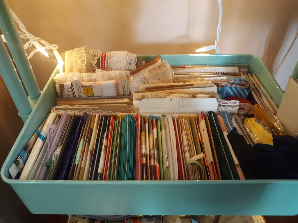 Since I usually use fabric that I’ve been given or purchased second hand, I don’t always have a large amount of yardage. I decided before folding and storing each length of fabric to note the width and yardage on a slip of paper which I pinned to the folded piece. This will make it a little easier for me to see which fabrics I can actually use for different projects based on the yardage.