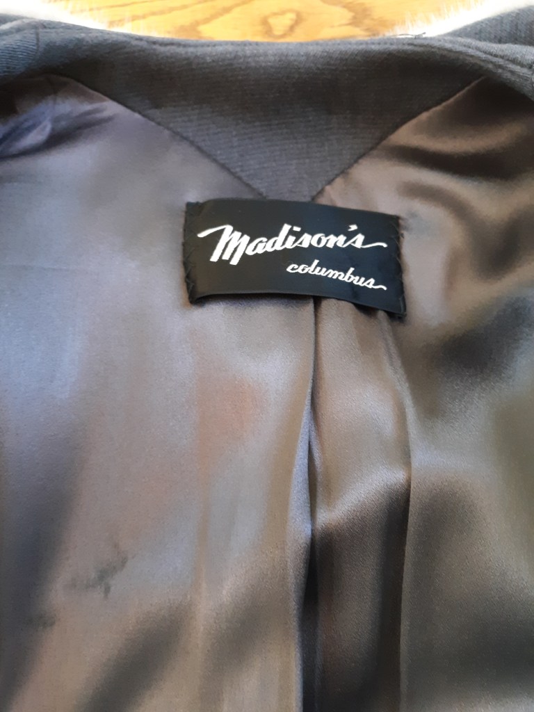 The second coat is charcoal, so I had more matching accessories (including black shoes from the 50s/60s, black hat, gloves, and handbag. The label says it is from Madison’s in Columbus, an Ilene original. I found a picture of the original department store building in this article here.