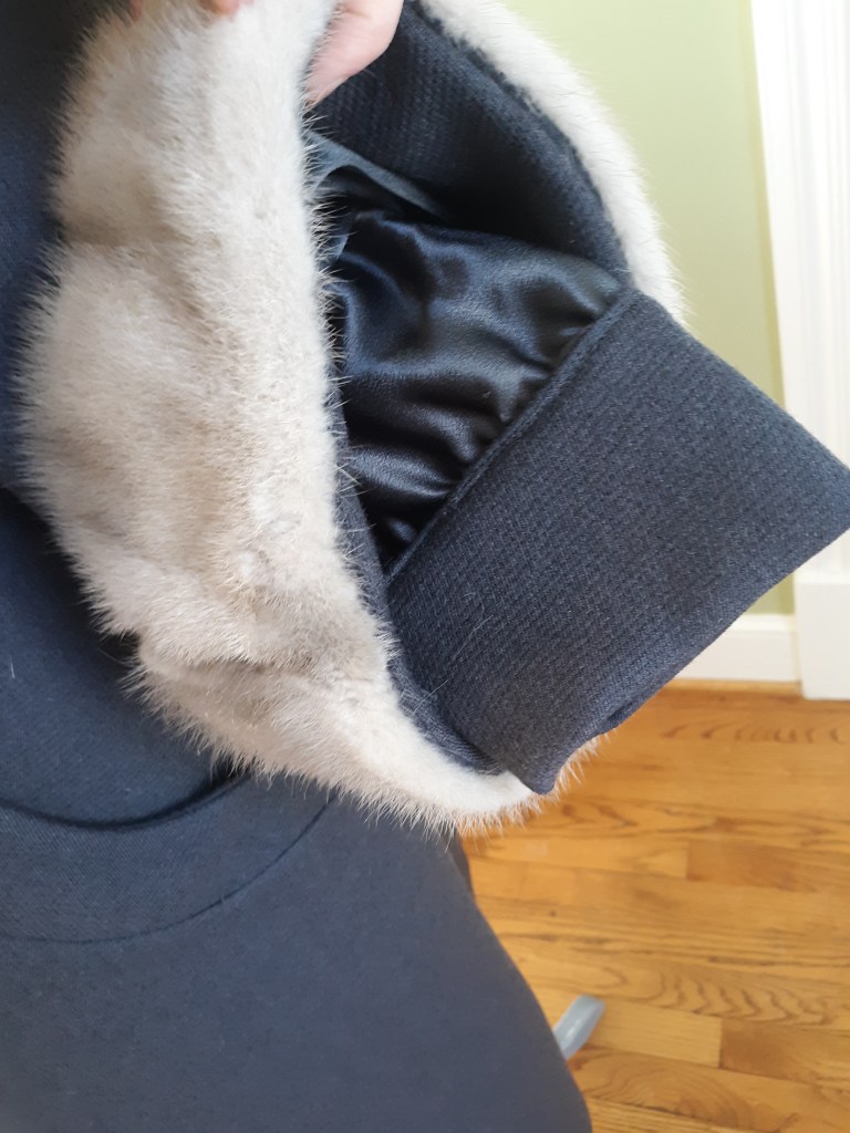 Please enjoy these details! I love the buttons, the scallopped fur on the bell shaped sleeves, the curved pocket, just all of it! This gray collar also can be hooked for a closer, warmer fit (I forgot a picture). Though the sleeves are wide, there is an under sleeve which fits close so cold air can’t get in as easily as it looks. This coat is very warm!