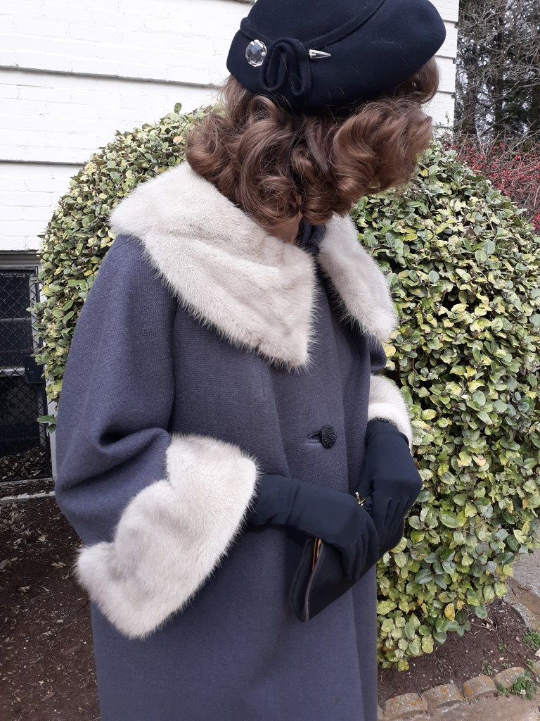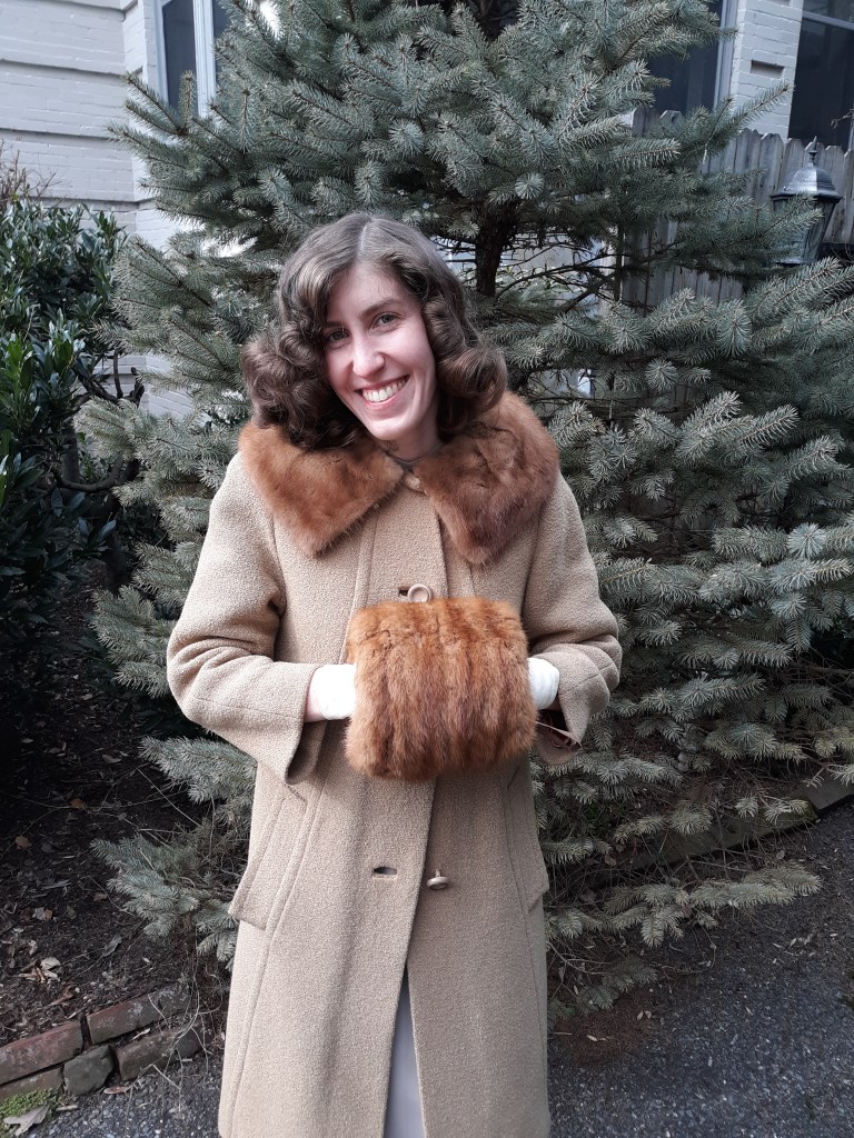 The fur collar is in great condition. It actually can be hooked together to create more warmth around your neck. For other accessories, I already had the matching fur muff. I added white kid leather gloves. The burgundy shoes are vintage (80s/90s vintage, not 50s/60s vintage). I didn’t have any winter hats that went with this color scheme, but I’ll be on the look out.