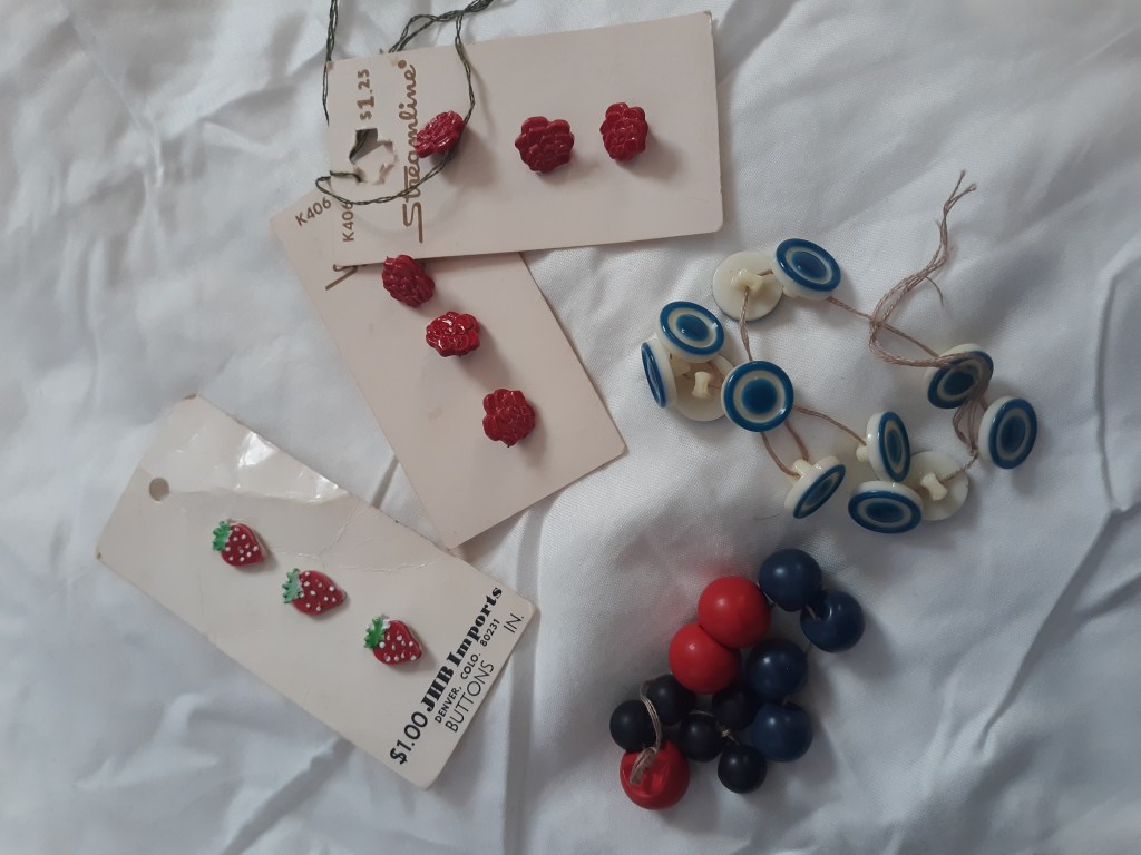 I thought I’d show you some of my favorites (from both this new haul and what I had collected previously). A few years ago, I got a great deal on a large set of buttons still on there original cards. Now, when I have sets of buttons not on cards, I either tie them together with embroidery thread or put them in a little plastic bag to avoid having to hunt through the whole jar again to know what is available.