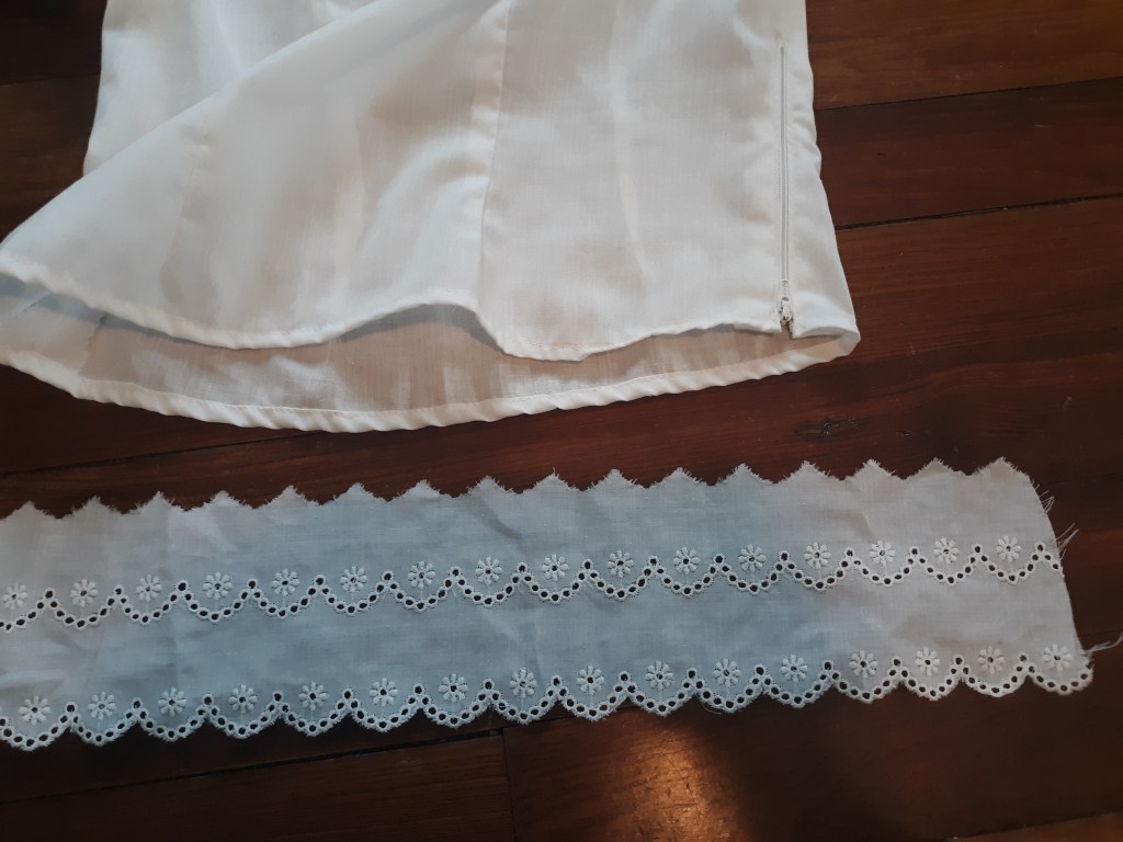 The solution…I found a pretty section of white eyelet. This added a couple of inches of length so that it would stay tucked in, but it also made it possible to wear untucked because the edge looked more finished.