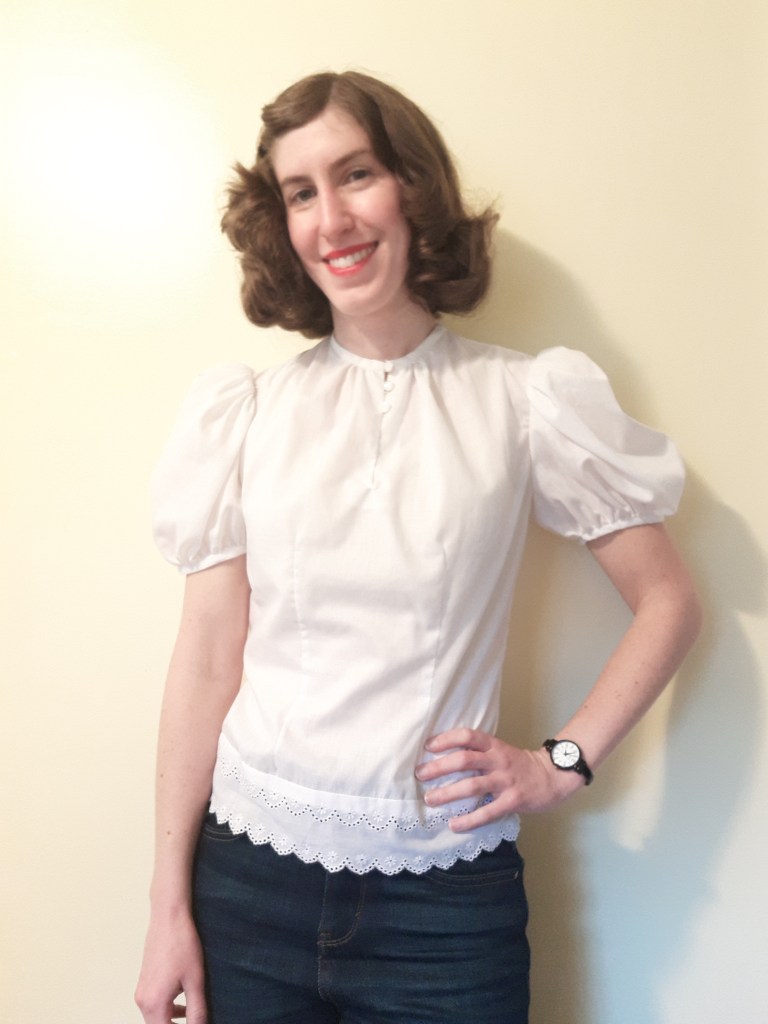 The first project was this white, puffed sleeve blouse. I think it’s so pretty! The problem…it was a bit too short. At first, I didn’t think it would matter since I planned to wear it tucked into high waisted skirts, but it was short enough that it would sometimes come untucked. If I did want to wear it untucked, the hem looked very homemade.