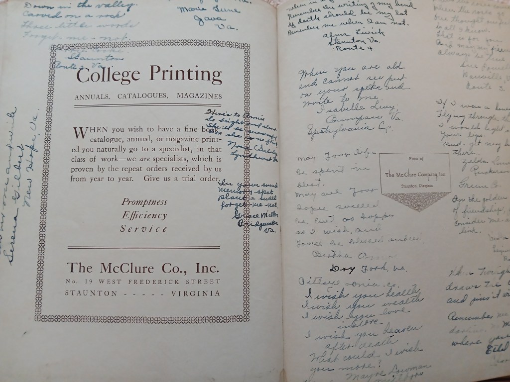 While working on this dress, I also started perusing a set of three yearbooks dated from 1923 to 1925 for a women’s college in Harrisonburg, Virginia. I love old yearbooks, especially when they have notes from friends! The funny, rhyming notes in these yearbooks reminded me of the ones signed in my great grandmother’s school autograph books. Yearbooks are intentionally meant to be a kind of memory book for the participants, but you can learn a lot about daily life in historical time periods through them too.