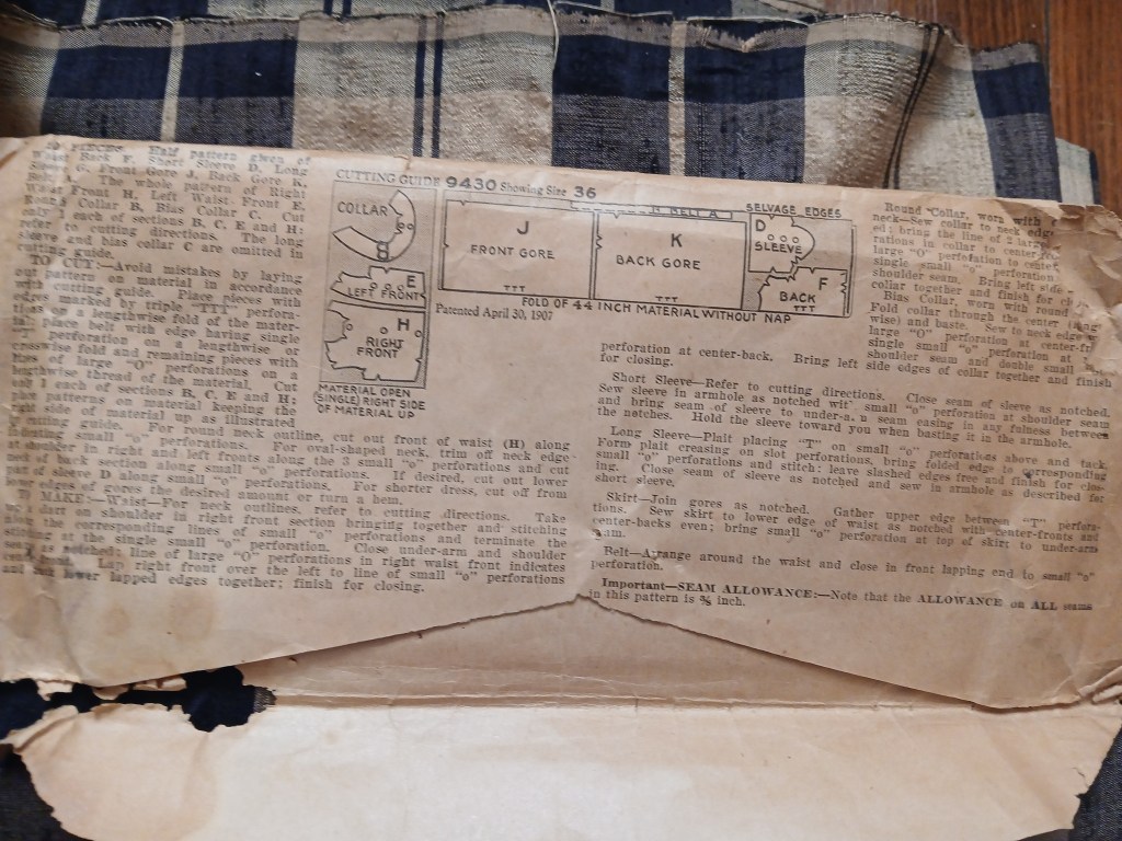 I was thrilled (and very surprised) when I found this pattern for $6 at an antique expo. It was even my size! See the price for the same pattern (Pictorial Review Pattern 9430) currently for sale! This pattern was patented 1907, but I think the copyright might have referred to the company, not the specific pattern. The style of the dress and the number sequence points to the early 1920s.