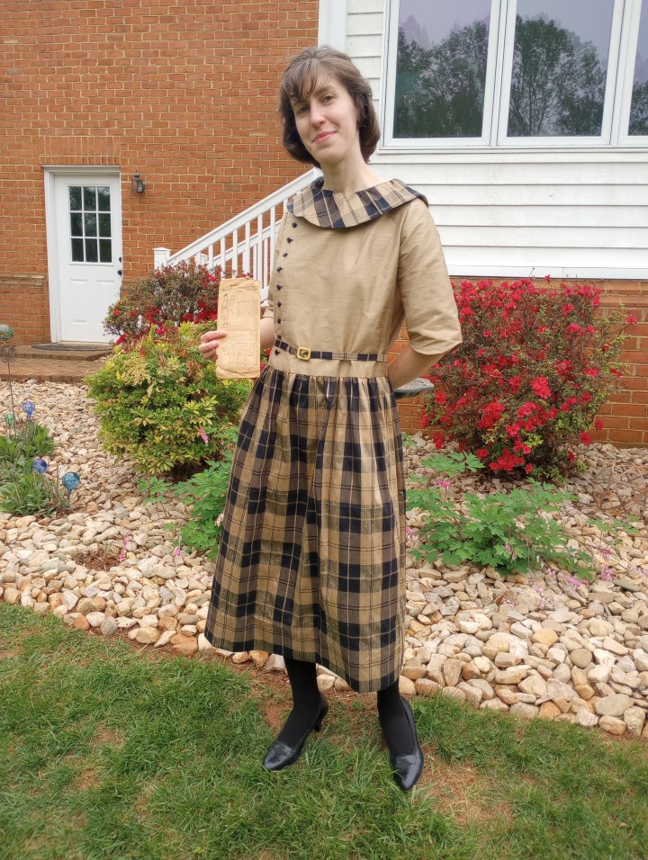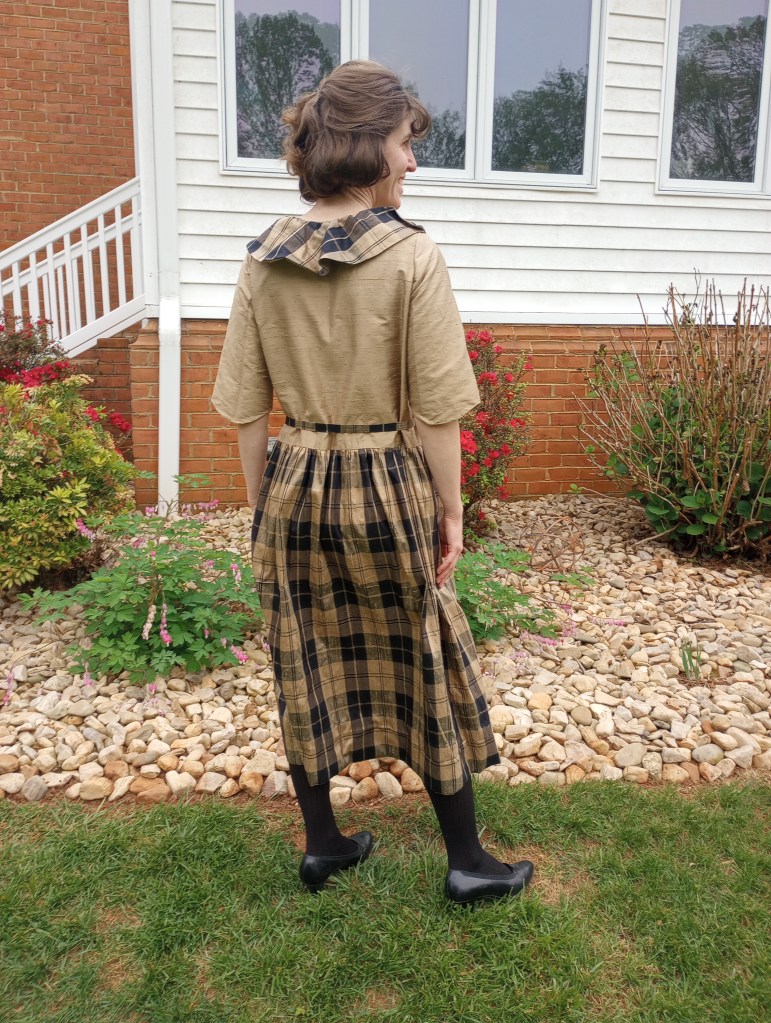 Disclaimer: I made this dress for the challenge of it, knowing the 1920s style is not really the most flattering for my body type. Because I don’t plan to wear this dress very often, I didn’t worry about it being washable. I had some small remnants of shantung silk and used two coordinating pieces (one champagne, the other a black and champagne check) for a dressy look. I also had a set of a dozen pearly black buttons (even though it took forever to hand sew the button holes!)