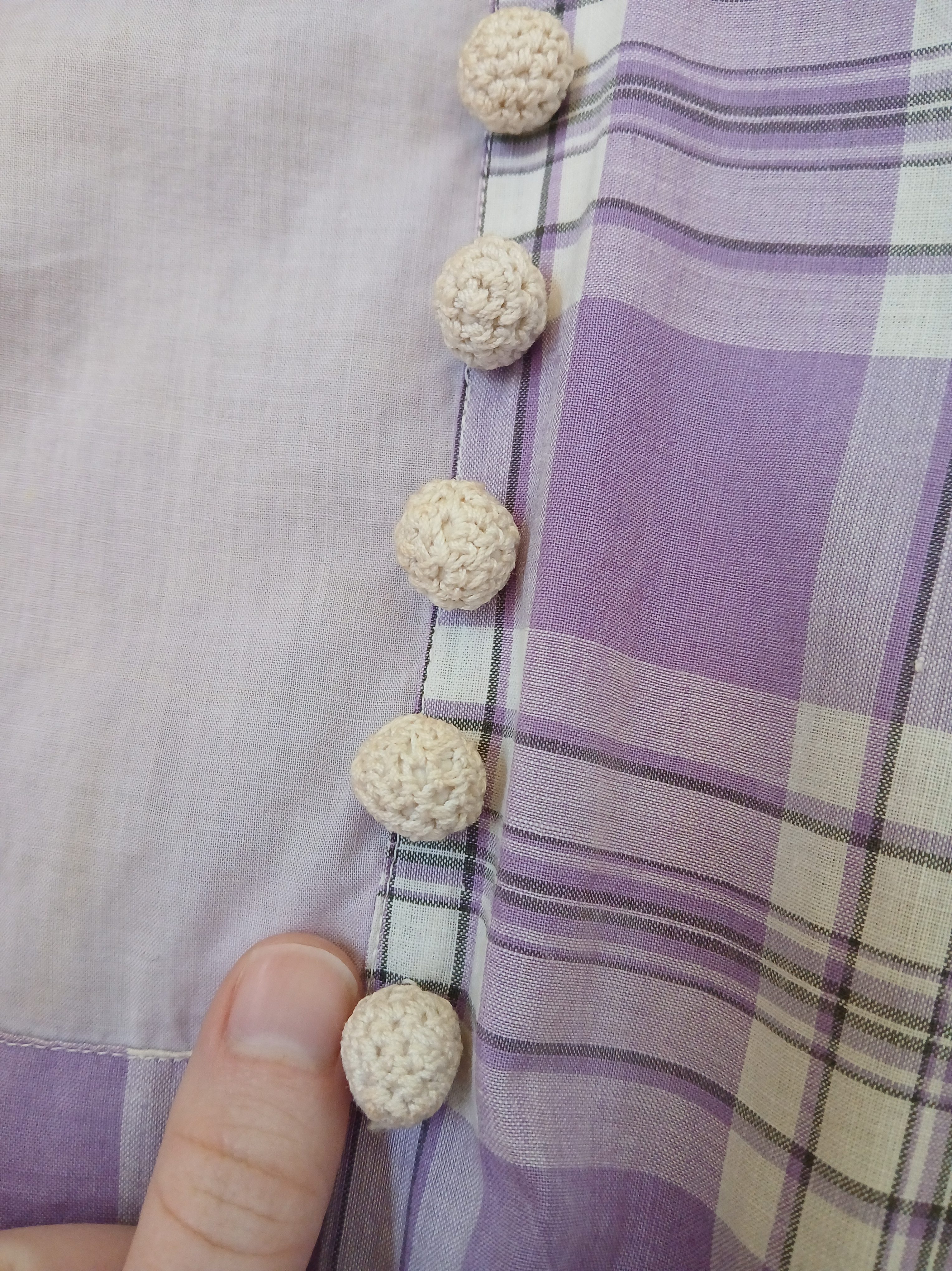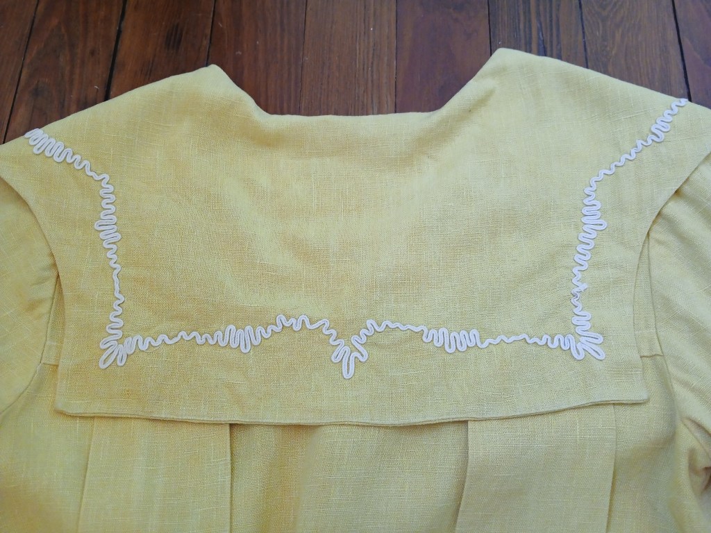 The belt was missing, so I made one out of white fabric which matched the texture and feel of the garment. I’m not sure if the original belt would have been yellow or white, but I am sure it would probably have had some embellishments, perhaps similar to the places around the collar and cuffs. I loved how the belt was secured by being passed through slits in the pleats instead of normal belt loops. The pleats allowed the garment to be tailored on top, but open into a fuller skirt at the bottom. The buttons are hand crocheted and gorgeous!