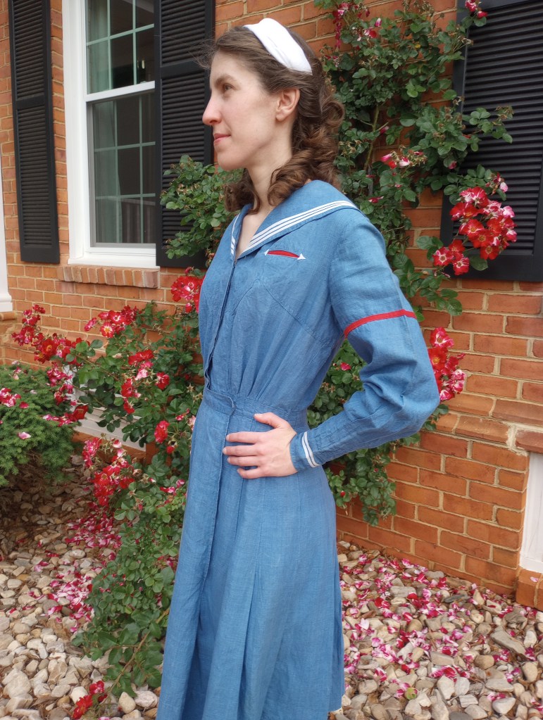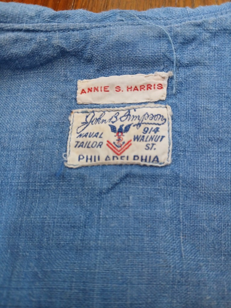 This second dress is probably from the middle of the 1910s, likely made during WW1. I’m not sure if this would have been a uniform or was meant to be a stylish garment which capitalized on the navy/sailor styling when patriotism affected the trends of the day. The fabric is very durable and heavy and the insignia seems specific, leading me to think it was more likely a uniform of some kind. Not necessarily a military/US navy uniform, but the uniform of some kind of support group or occupation.