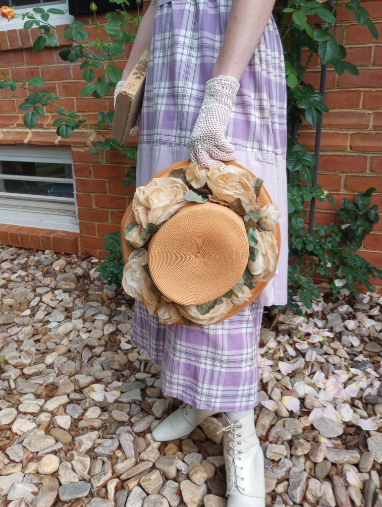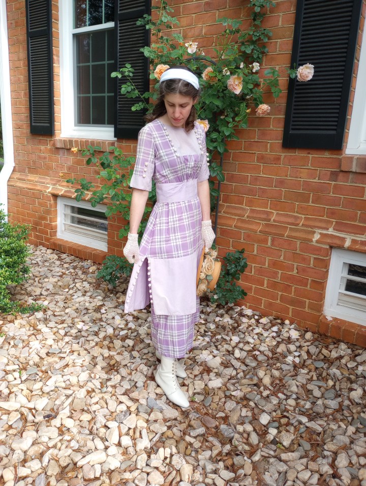 Finally, this purple dress is likely from the early 1910s, pre-WWI. I’m guessing this based off the length of the skirt and the style of over skirt. This one has a back closure, similarly, in two different places (three if you count fastening the belt which is attached). It was difficult to put on myself so the wearer might have had regular assistance in dressing, another sign it was probably earlier.