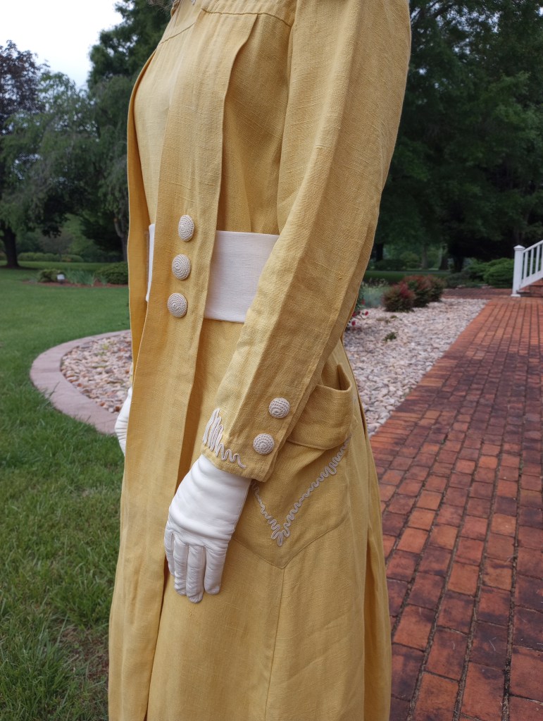 From the silhouette, I believe this yellow dress was made in the late 1910s. It still has a natural waistline but is not as tailored. It is a very thick material. That, along with it being loose fitting with a front closure, makes me wonder if it was an over dress, maybe to wear on an automobile ride?