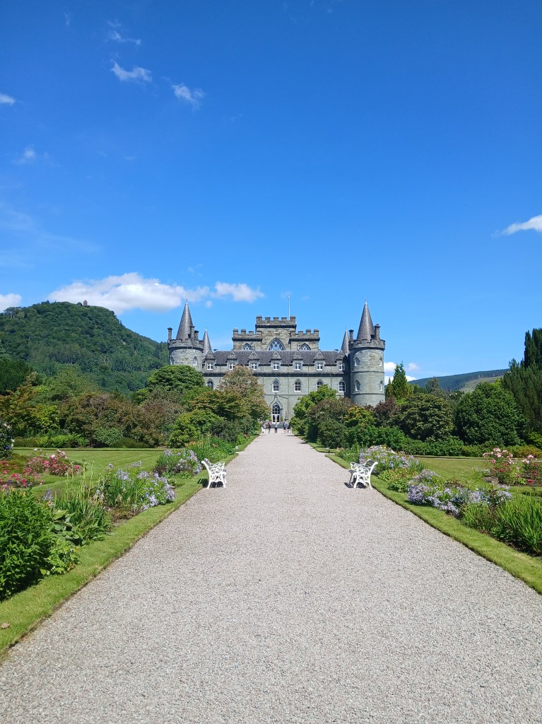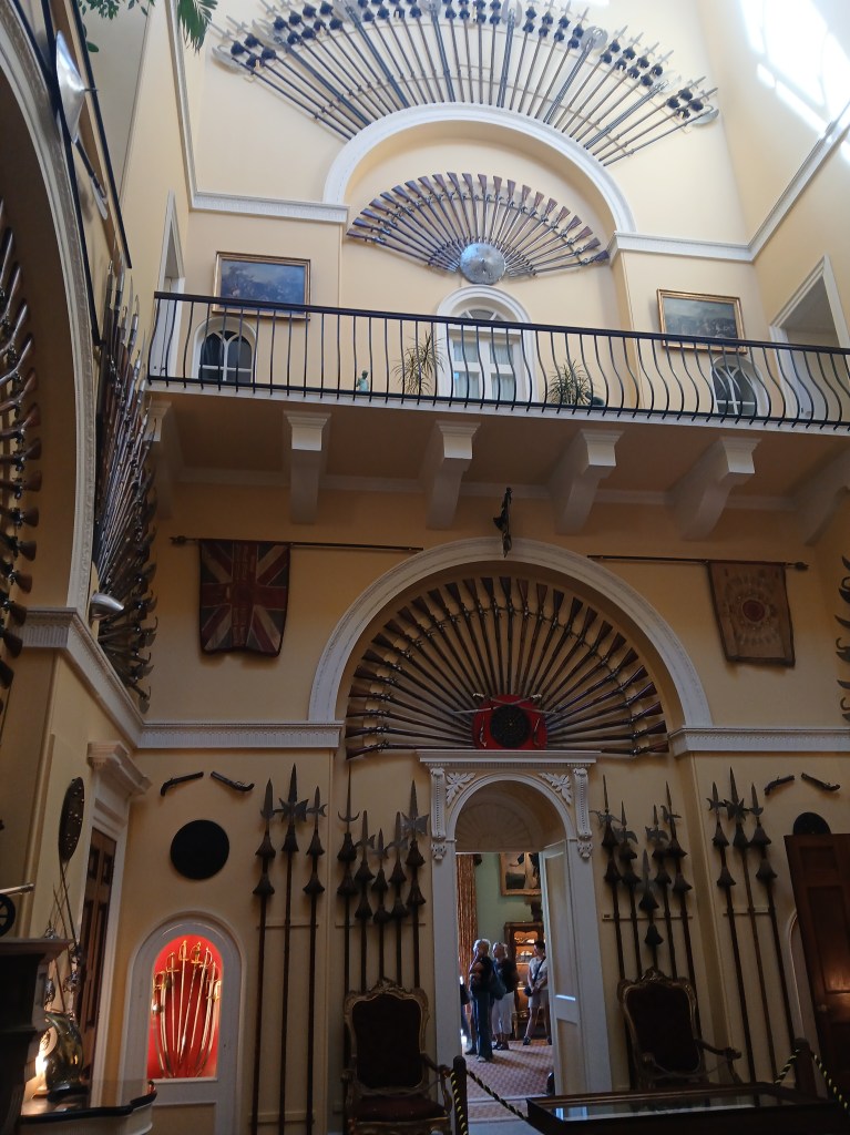 We had a long stop in the town of Inverary and got a tour of the castle there. This is a privately owned home (belonging to the Duke and Duchess of Argyle). The interior was beautiful! The entry foyer with all of the arms was particularly striking, but I also loved looking at their china (in a rounded turret room), and the luxurious parlor and dining areas. Before we left the castle, we got our lunch here at their tearoom and, of course, ordered tea as well.